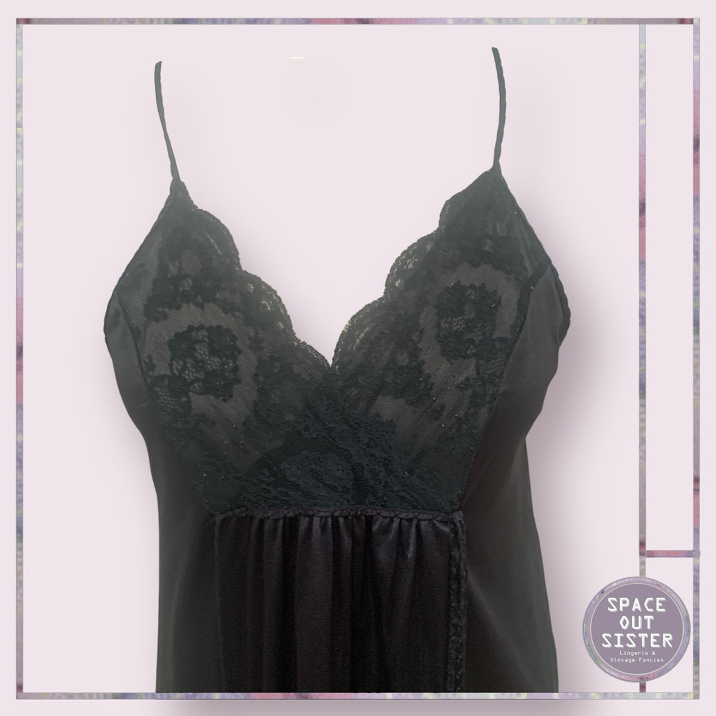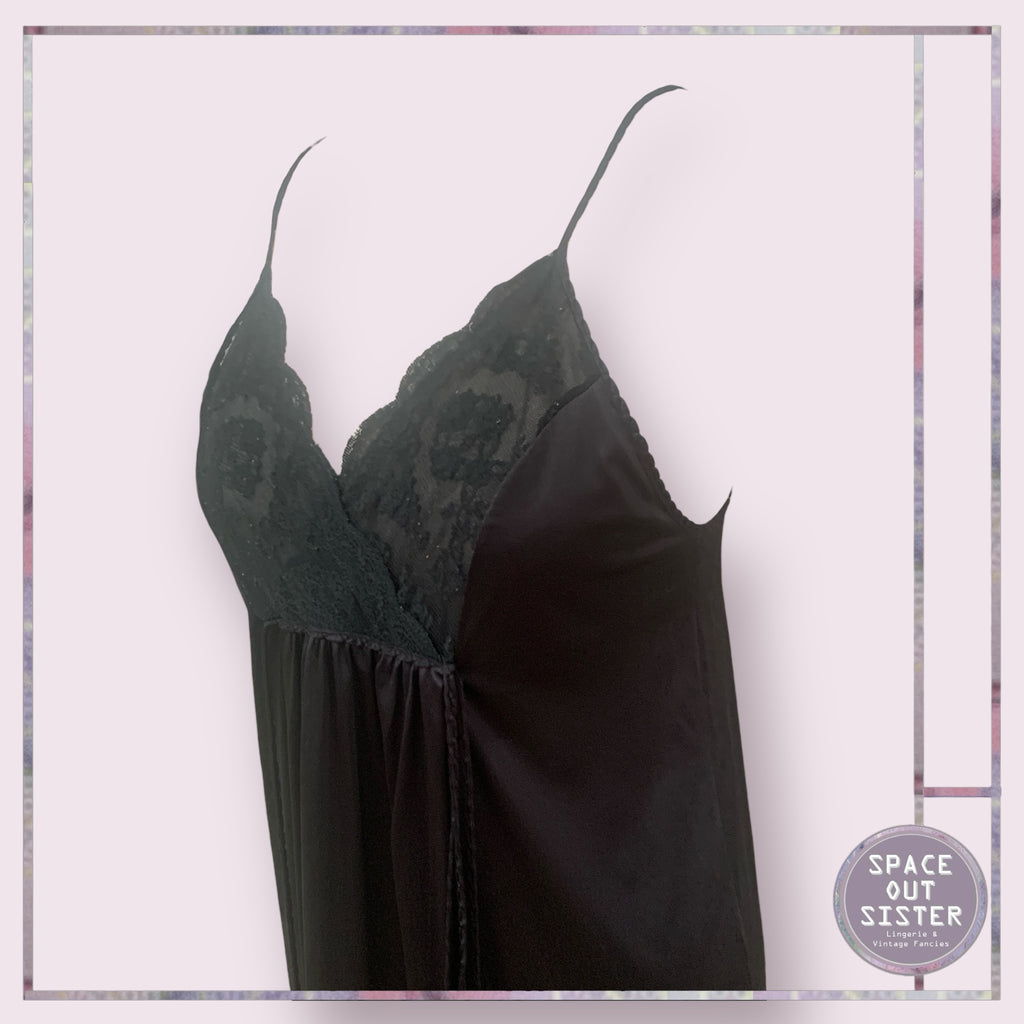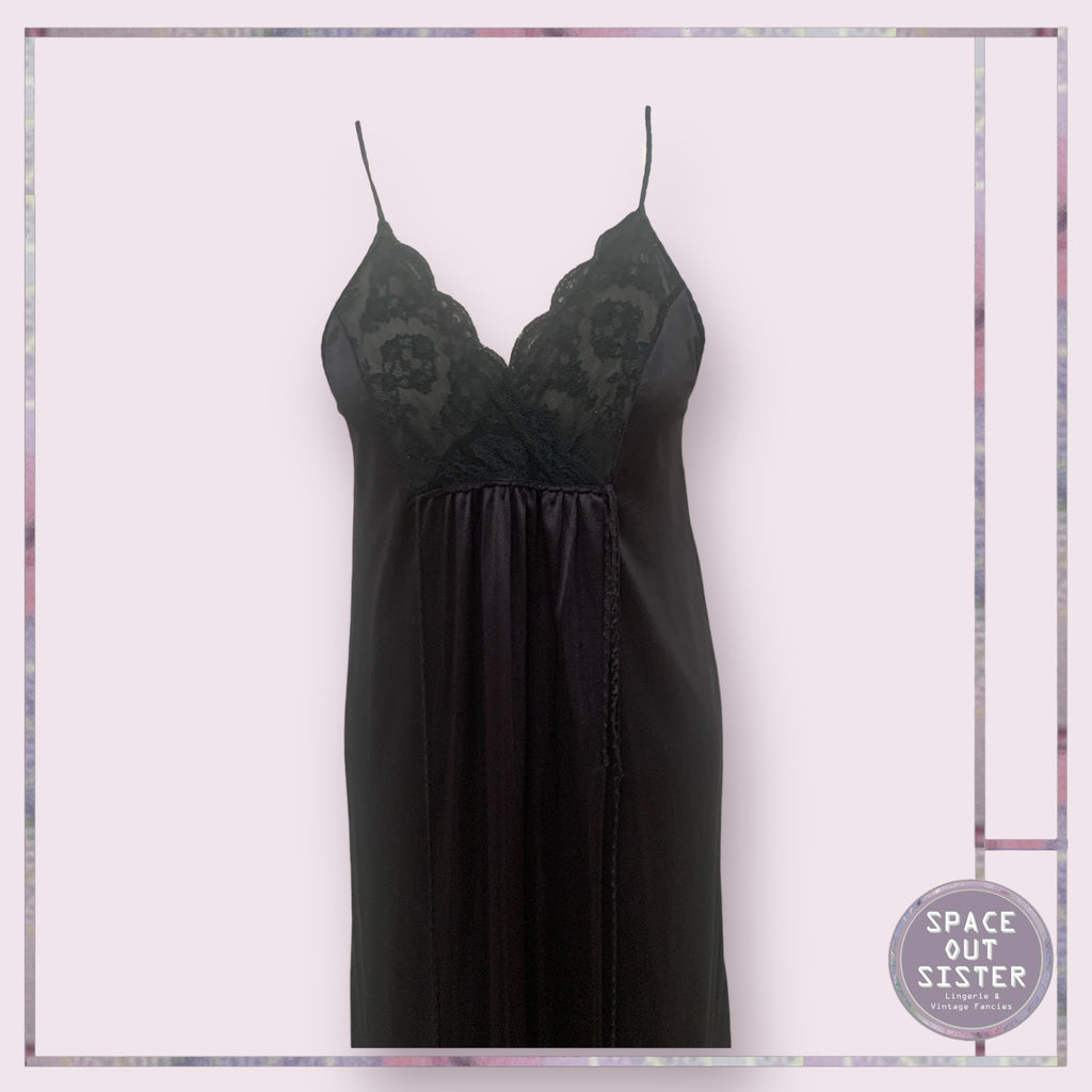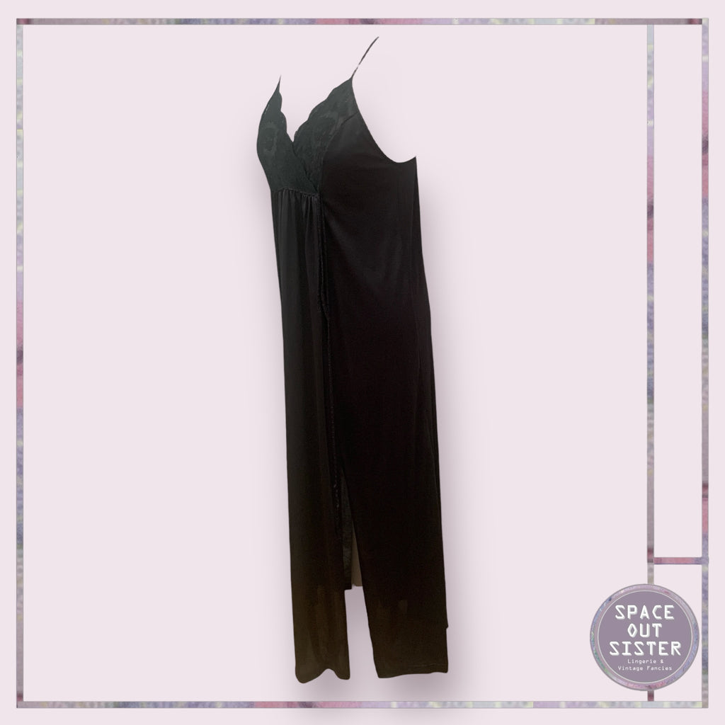 Indulge in elegance with our Vintage Gilead Black Nightdress. This full length nightdress features delicate spaghetti straps and a leg split for a touch of sophistication. The V necklace, adorned with lace, adds the perfect feminine touch. Unwind in style with this timeless piece.