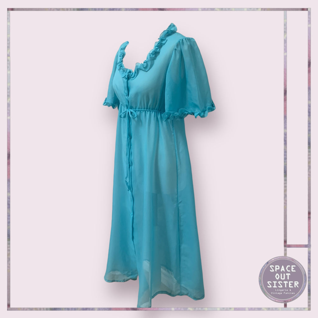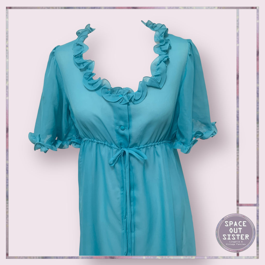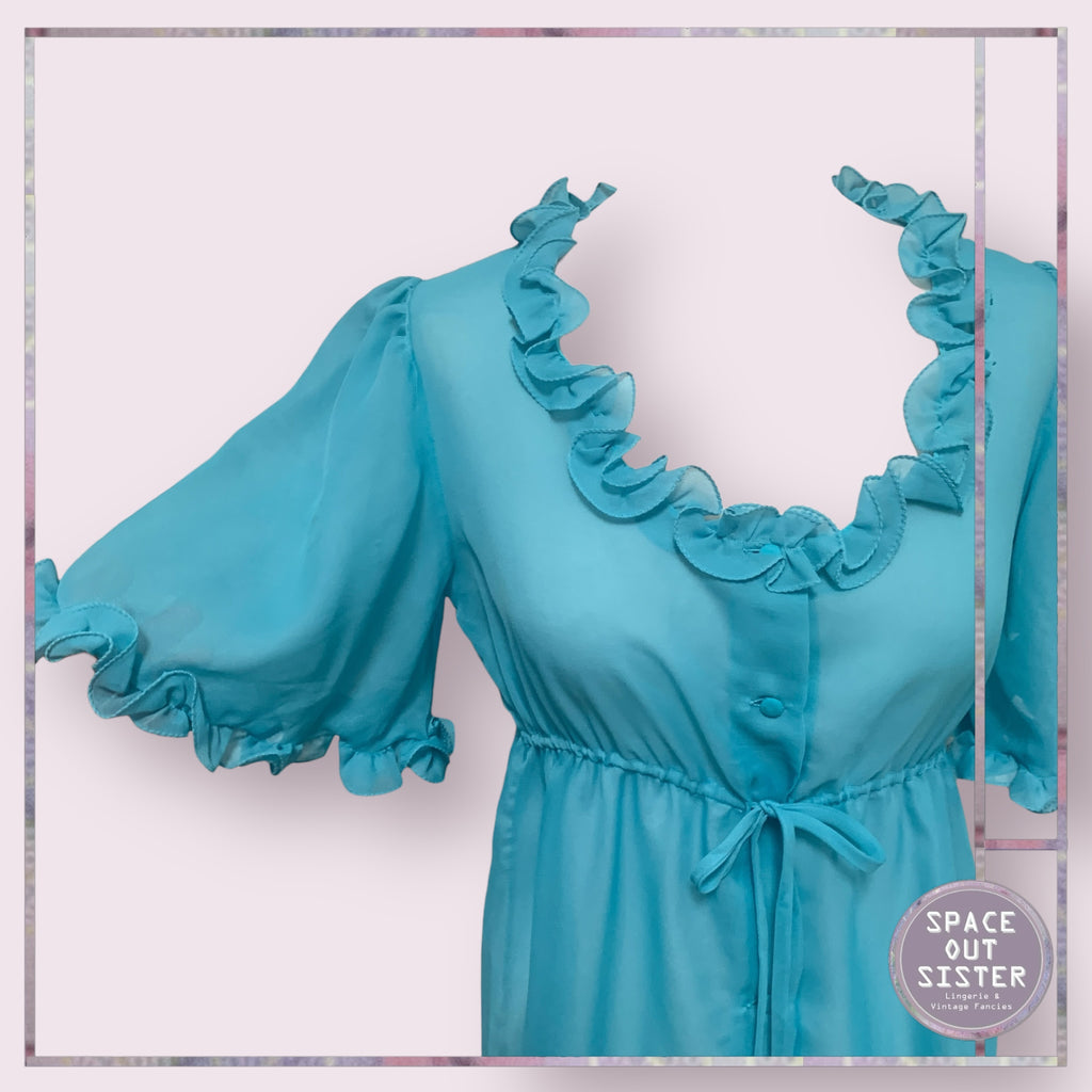 This vintage nightdress in turquoise is absolutely darling. Its ruffle neckline adds a touch of femininity, while the button front and belt provide a classic and comfortable fit. Elevate your sleepwear collection with this charming piece.