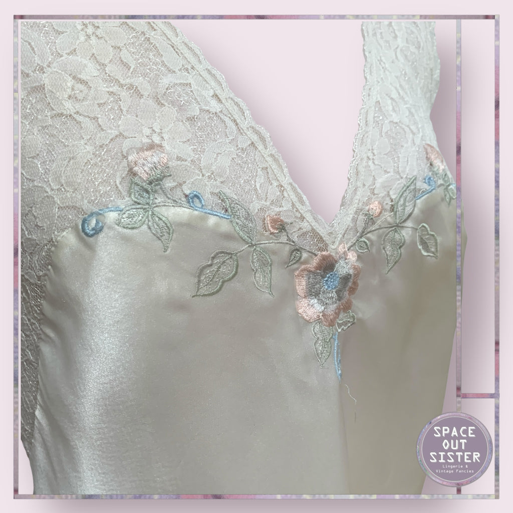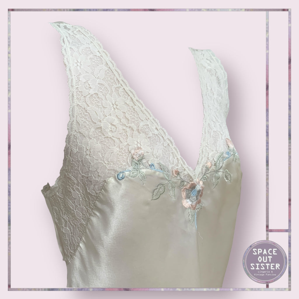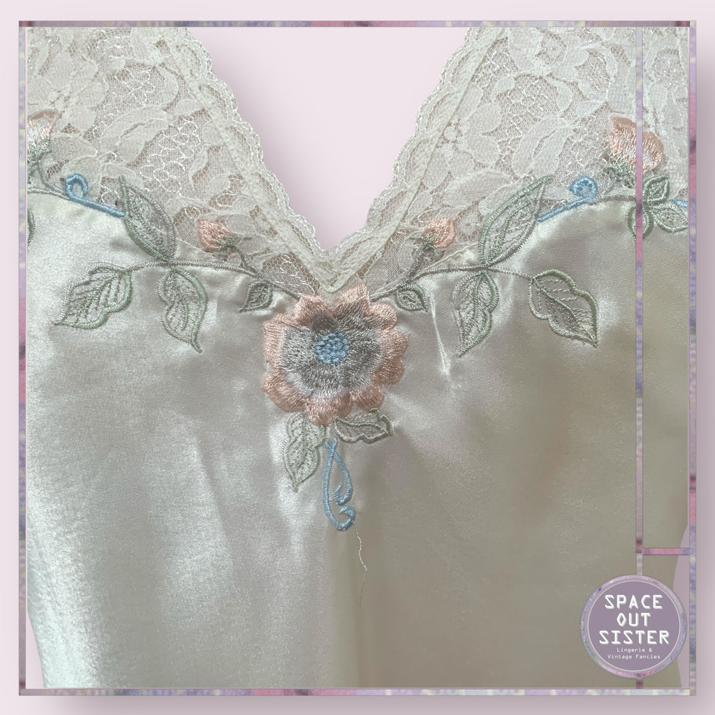 Stunningly beautiful Vintage Val Mode Slip Dress is ivory with pastel coloured needlework on the bust area. V neckline and above the knee in length. As seen, some satin pulls as the last photos show.