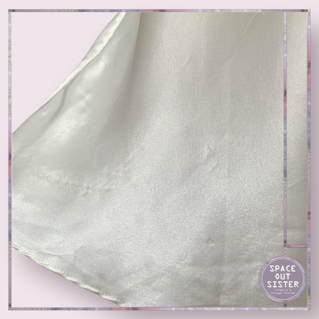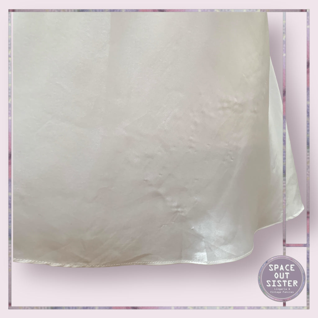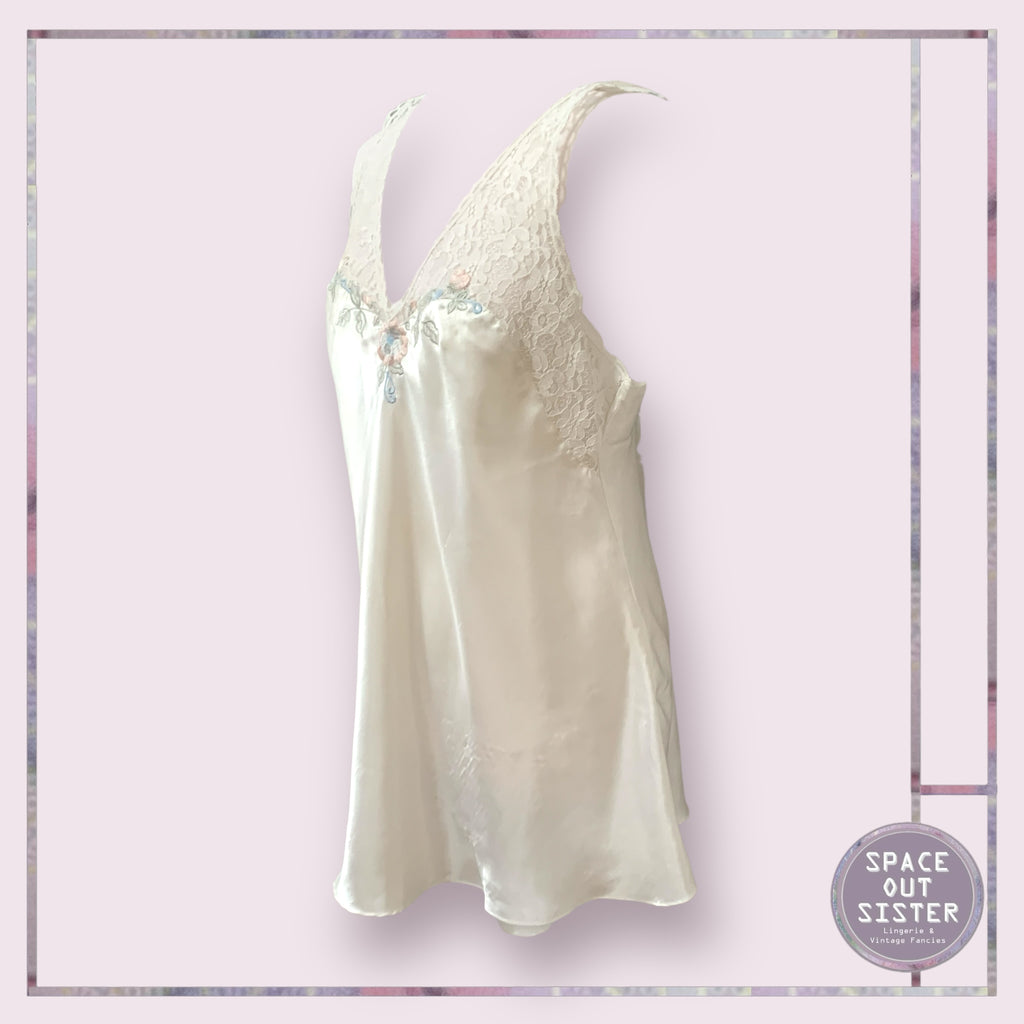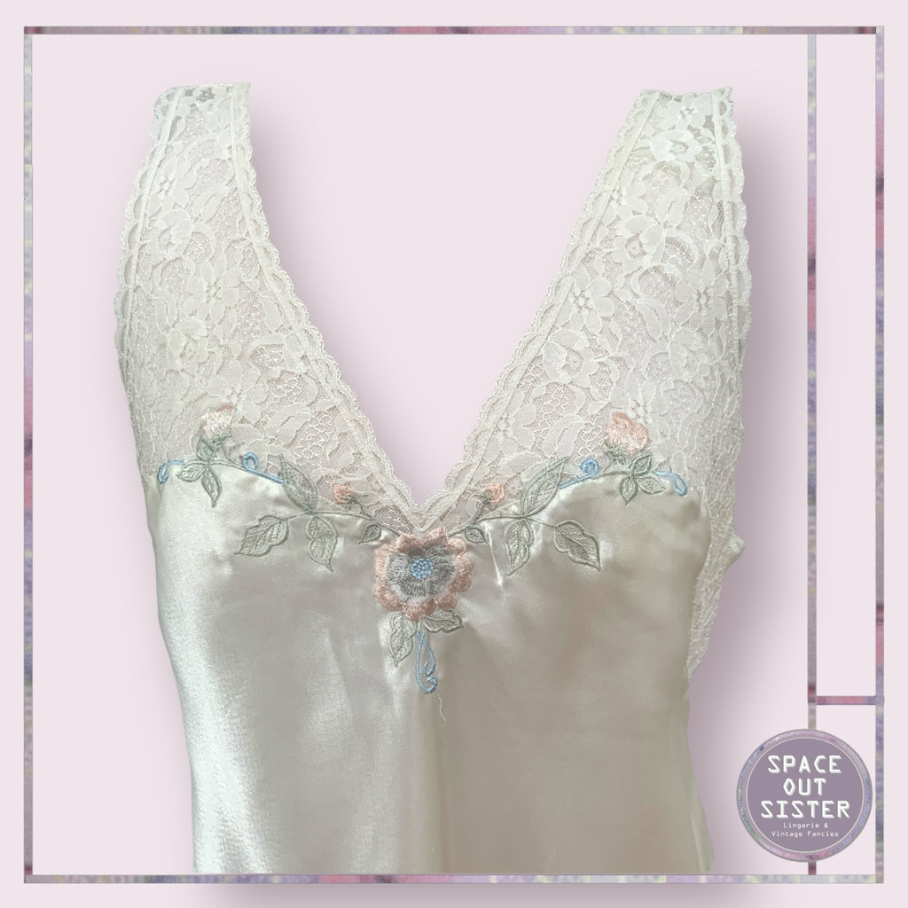 Stunningly beautiful Vintage Val Mode Slip Dress is ivory with pastel coloured needlework on the bust area. V neckline and above the knee in length. As seen, some satin pulls as the last photos show.